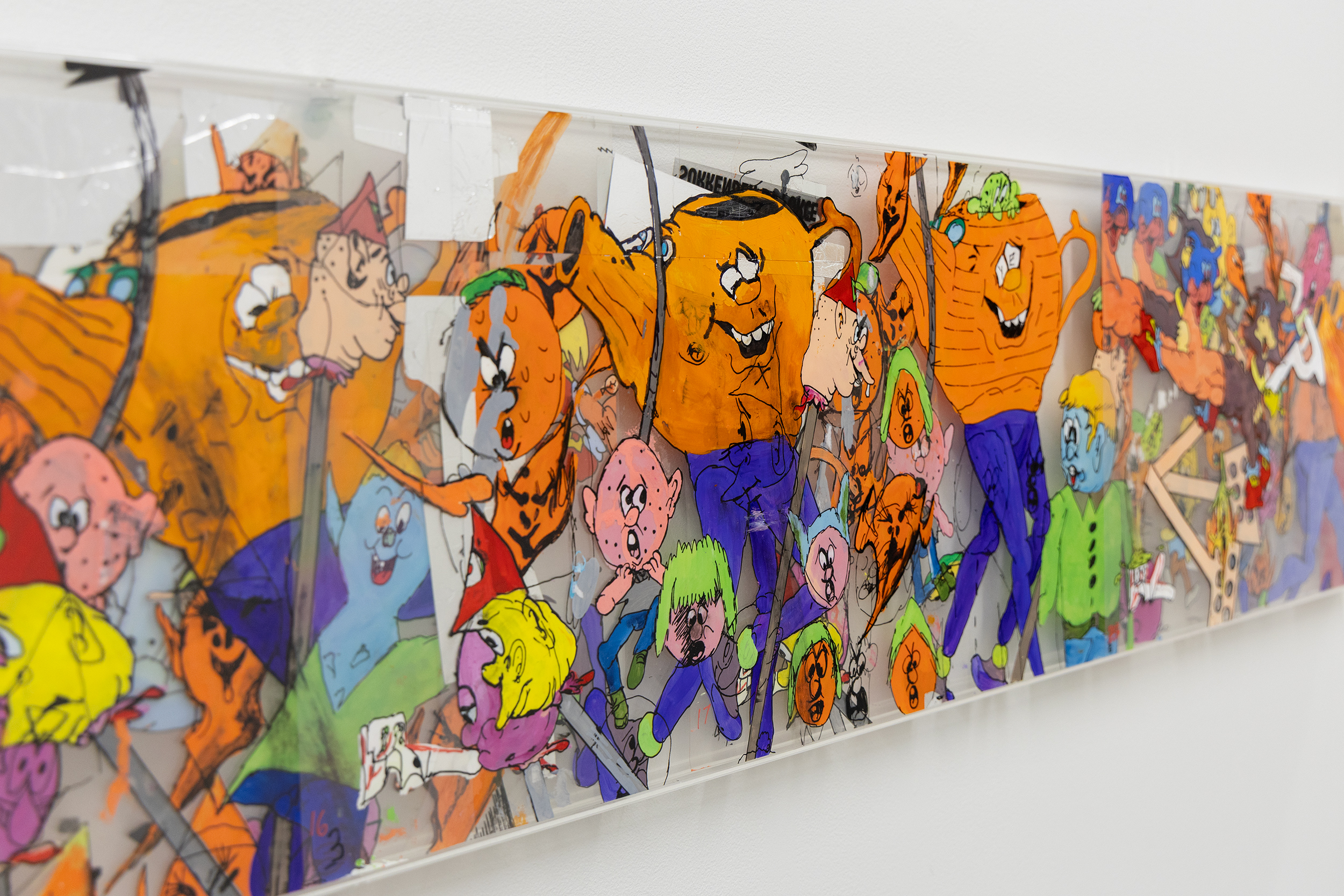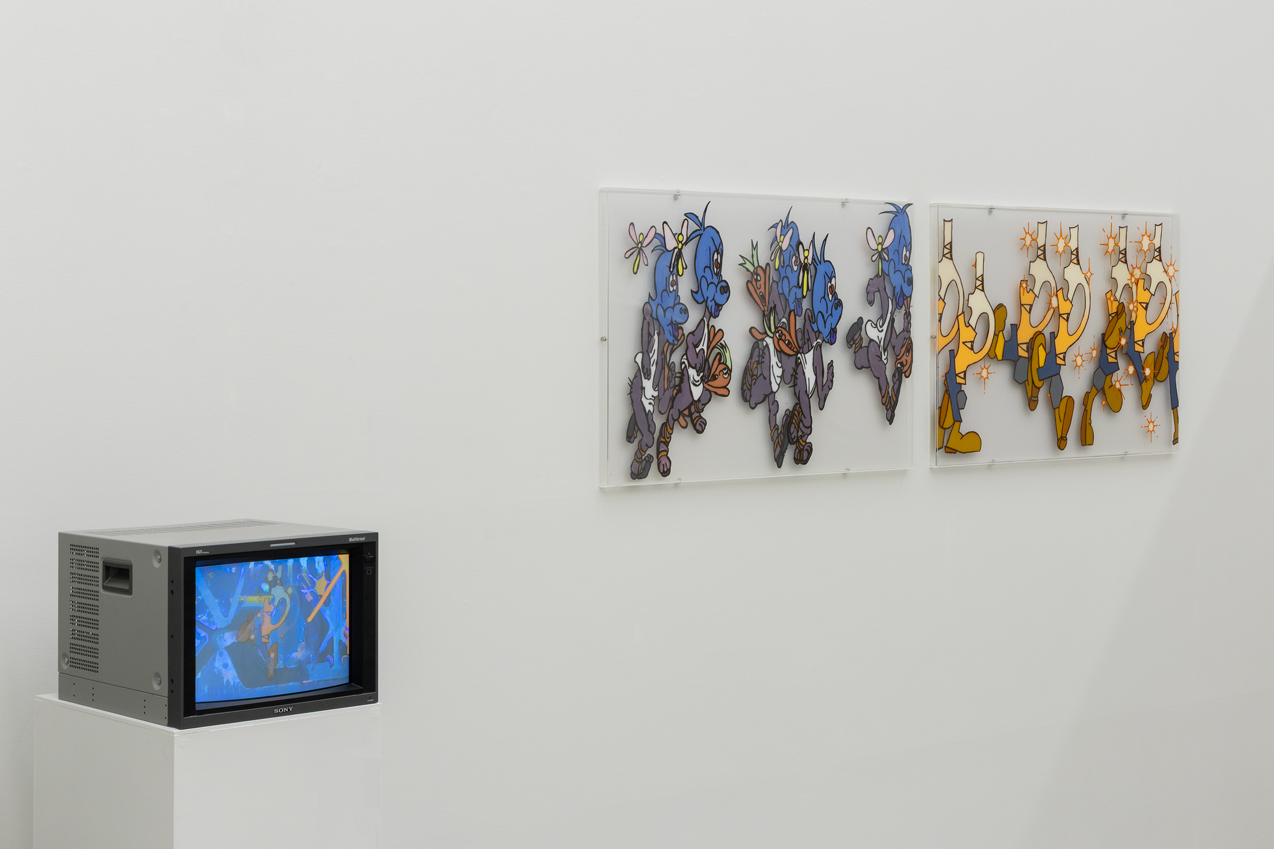 …much animation today has fallen victim to a cartoon physics in which realism has overtaken potentiality. Rather than disruptive, uncontrollable, digital animation has led to a strange respect for realism to the point of its own obsolescence. Its perfection makes it disappear. Yet what Sadler and Maurice also share alongside their skewed, off-centre, wigged-out visual world is an analogous fixation on the analogue and sculptural capacity of animation. Here, each cel is not only understood as an individual art work in its own right but as an object both flat and solid, transparent and opaque, two- and three-dimensional simultaneously. Moreover, the demanding process of traditional production that the two have chosen creates both a dense precision, forcing one to indulge in the act of repetition (or go mad), as well as clear permission to reject the grand and focus instead on the modest. How can we not just suggest motion but bring things to life? How can we merge these different worlds and bring a new world into creation? Within this enforced austerity, then, magic can still accrue. The flickering of the images, their movement in front of our eyes, not only makes our brain believe (or tricks it, perhaps) but simultaneously makes us feel their animative quality whether we want to or not. We feel its personhood. The way they live and breathe. The way they loop, the way they splurge and they walk. The way their bones protrude and squish together. The way they transubstantiate and metamorphosise, not just rejecting physics but finding a new way of thinking through physics itself.