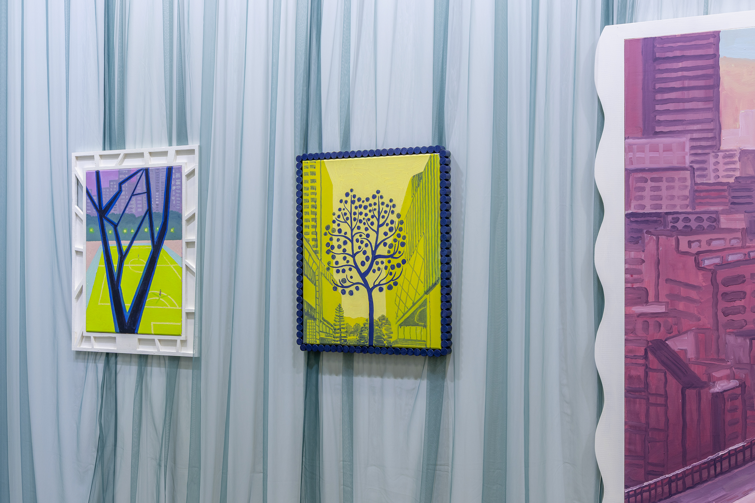 ニューヨークを拠点に活動するマサミツは、都市の中にある自然と建築物をモチーフとして描いていますが、それらの作品が完成するまでの過程における日々のドローイングを大切にしているといいます。訪れる場所を観察し、彼の目を惹きつける一瞬を記録して、ノートに描くことを繰り返す。それらの習作には水彩、ペン、色鉛筆などの様々な画材が使われ、その時の情景や、彼の受けとった印象がリアルに捉えられています。またマサミツは、それぞれの絵からインスピレーションを受けた額縁を自ら制作し作品の一部としています。そのことによって一見すると平面的に見える作品において、実は彫刻的な側面が重要な役割を果たしていることに気付かされます。額縁は絵と現実の世界を繋ぐための役割も担っており、描かれた世界と現実世界の隔たりを崩し、その主題をギャラリーの空間にまで広げているのです。キャンバスに描かれたどこか遠くの景色が周りの枠を介することによって鑑賞者の手元まで引き戻されるマサミツの絵画は、場所や距離、国境など日頃我々が縛り付けられている物理的な条件から解放してくれるように感じられます。